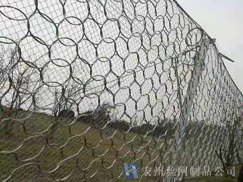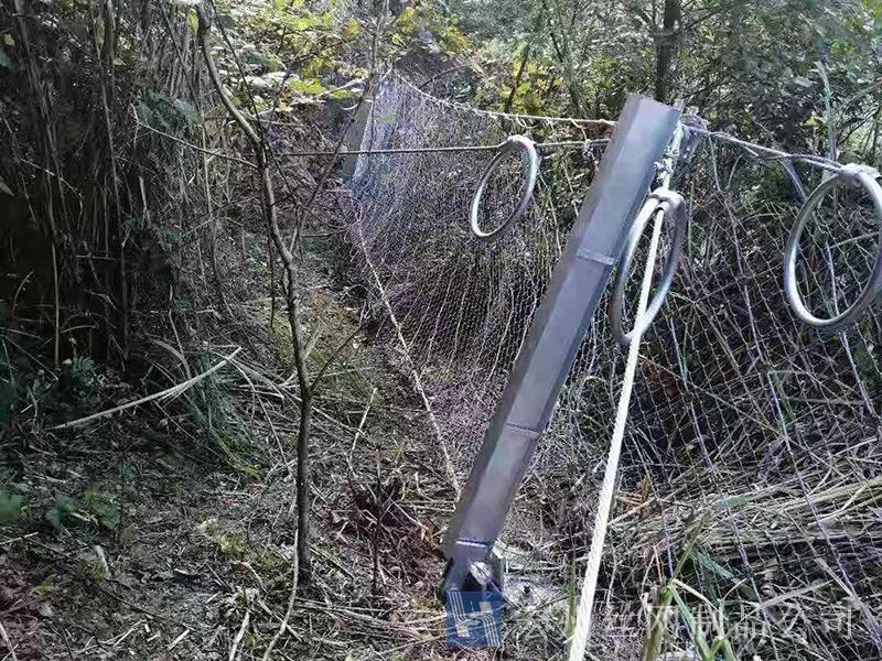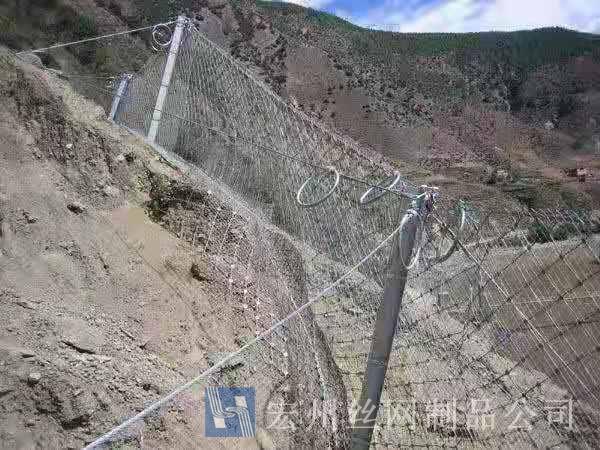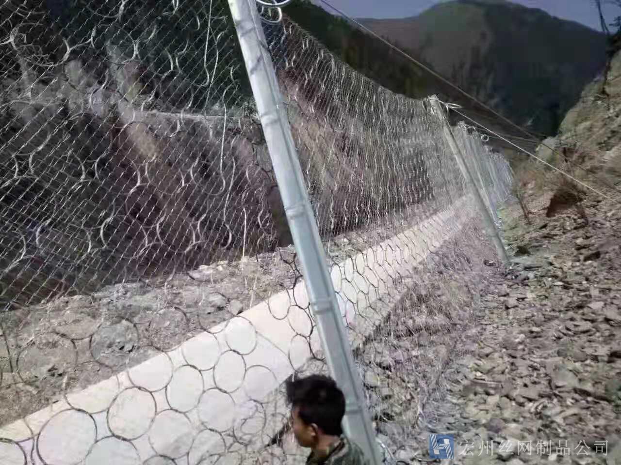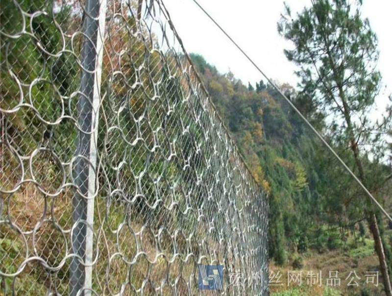 材質(zhì):鋼絲繩網(wǎng)、支撐繩和減壓環(huán)構(gòu)造:由鋼絲繩網(wǎng)或環(huán)形網(wǎng)(需攔截小塊落石時附加一層鐵絲格柵)、固定系統(tǒng)(錨桿、攔錨繩、基座和支撐繩)、減壓環(huán)和鋼柱四個主要部分構(gòu)成。